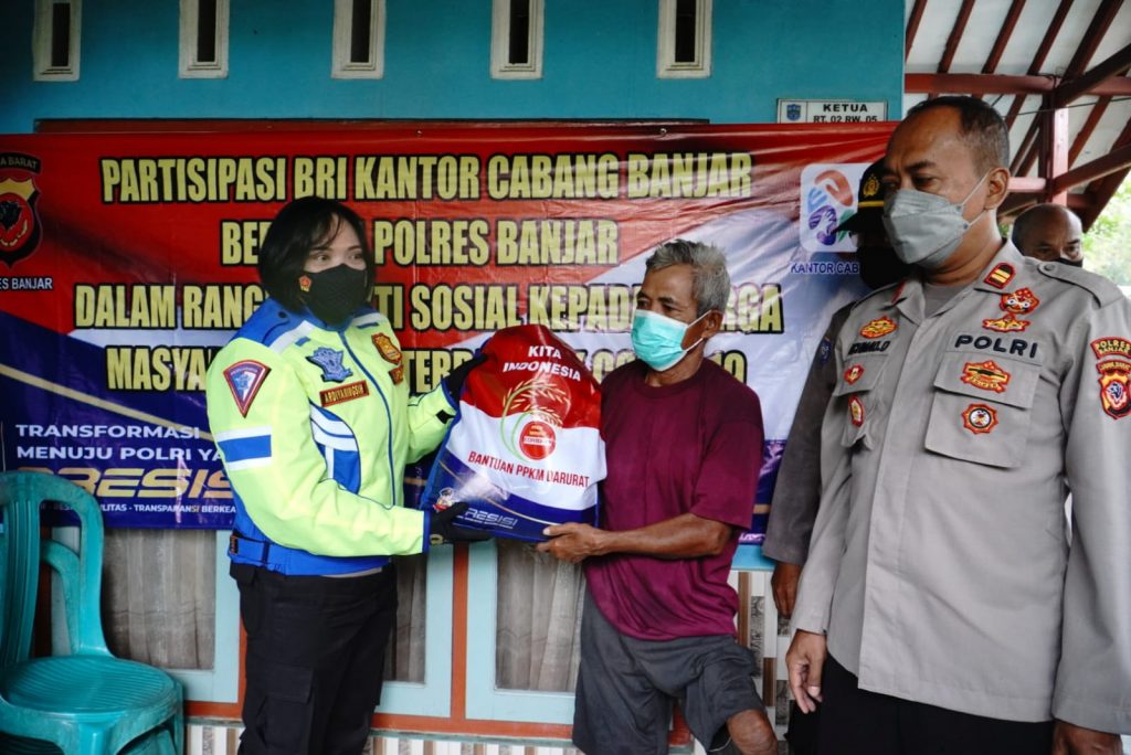Kegiatan baksos diberikan oleh Kapolres Banjar Polda Jabar AKBP Ardiyaningsih, S.I.K., M.Si. kepada perwakilan warga yang diterima oleh Bapak Acin. dengan keseluruhan jumlah paket bansos yang diberikan berjumlah 50 paket sembako.